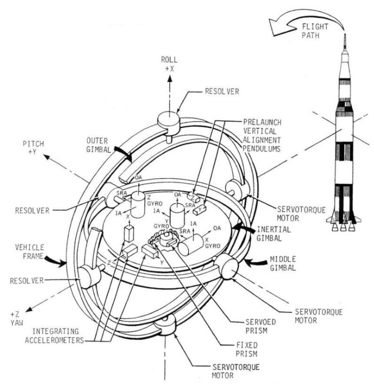 The ST-124-M3 inertial platform contains three gimbals: the outer gimbal (which can rotate 360° about the roll or X axis of the vehicle), the middle gimbal (which can rotate ±45° about the yaw or Z axis of the vehicle), and the inner or inertial gimbal (which can rotate 360° about the pitch or Y axis of the vehicle). The inner gimbal is a platform to which are fixed several components: