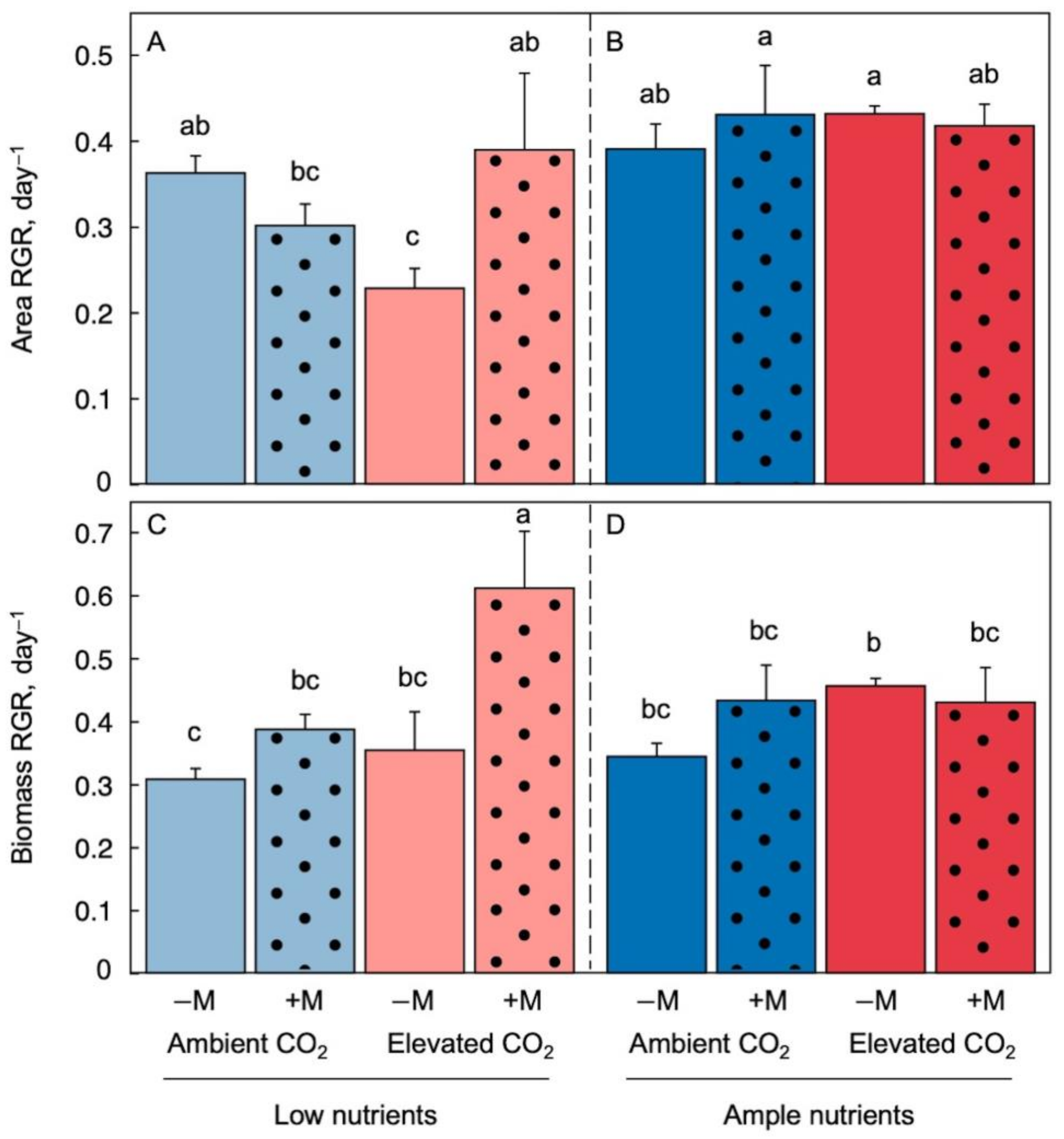 Figure 1. Relative growth rate (RGR) of frond area expansion under low (A) and ample (B) nutrients as well as RGR of dry biomass production under low (C) and ample (D) nutrients for Lemna minor grown in 1/20 (light blue or light red) or 1/2 (dark blue or red) strength Schenk & Hildebrandt medium under either ambient (blue) or elevated (red) CO2 levels. Blue and red-color columns indicate ambient and elevated CO2, respectively. Solid-fill columns represent plants that were not inoculated (−M) and dotted columns plants that were inoculated (+M) with microorganisms from a pond with L. minor. Mean values ± standard deviations; n = 3. Different lower-case letters represent significant differences at p < 0.05.