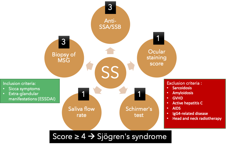 Figure 2. Overview of the American College of Rheumatology/European League Against Rheu-matism criteria for primary Sjögren’s syndrome 2016. This classification criteria applies to an individual who meets one of the inclusion criteria and does not have any of the exclusion criteria. A score of 4 or above confirms the diagnosis of pSS.