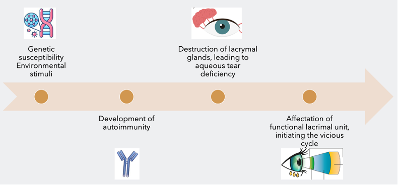 The pathogenesis of primary Sjogren's syndrome (pSS) is a complex process with multiple contributing factors (Figure 1). It is believed to involve the interaction between genetic susceptibility and environmental exposures, leading to the development of an autoimmune T-cells mediated reaction. This reaction leads to the destruction of the lacrimal glands and a decrease in aqueous tear production, partly due to an increase in programmed cell death. This, in turn, affects the functional lacrimal unit, initiating a vicious cycle of dry eye disease (DED).