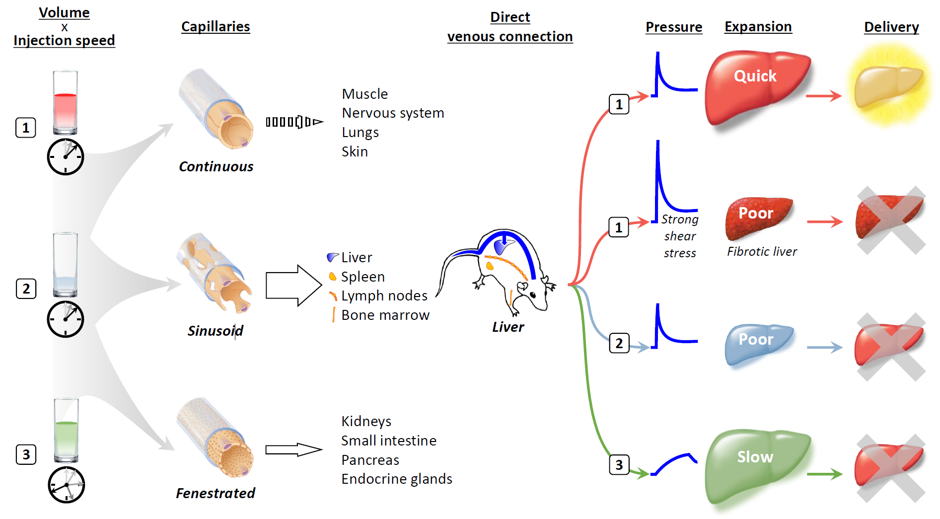To achieve effective hydrodynamic delivery, the physical impact of the injection must be transmitted to target cells through the solution's movement. If a physical impact that can quickly traverse the endothelium and basement membrane and cause organs to expand rapidly can be accomplished through local regional injection, hydrodynamic delivery may be a promising strategy not only for the liver but also for other organs.