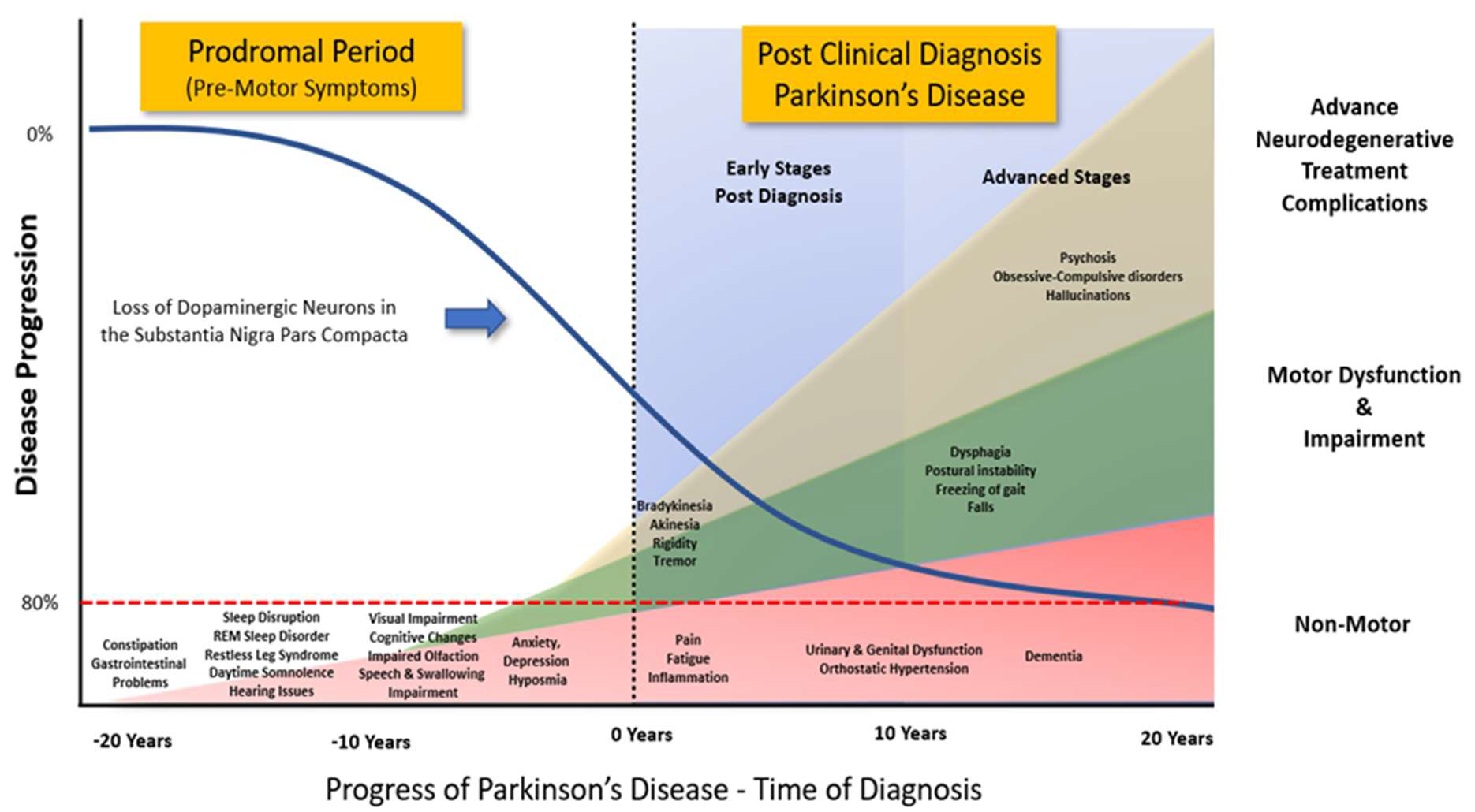 Figure 2. Progression of Clinical Symptoms from Early Prodromal through to Clinical Diagnosis of Parkinson’s Disease. Clinical diagnosis of Parkinson’s Disease accepts that there is a potential loss of up to 80% of the dopaminergic neurons in the Substantia Nigra Pars Compacta. However, prior to the emergence of any significant motor impairment, a wide variety of symptoms associated with non-motor dysfunction and disability usually precede the clinical diagnosis of Parkinson’s disease by 10-20 years. (Adapted from data and figures in Kalia et al., [61], Parkinson's disease. The Lancet, 386(9996), 896-912, and Tansey et al., [62], Inflammation and immune dysfunction in Parkinson disease.