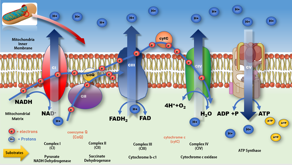 Figure 3. Mitochondrial electron transport chain and production of ATP. Impeding the flow of electrons along the ETC at CI increases production of free radicals resulting in a rise in oxidative stress and lower production of ATP at CV. A more complete review of mitochondrial bioenergetic function and associated impacts on various disease processes can be found in Protasoni et al. 2021 [70].