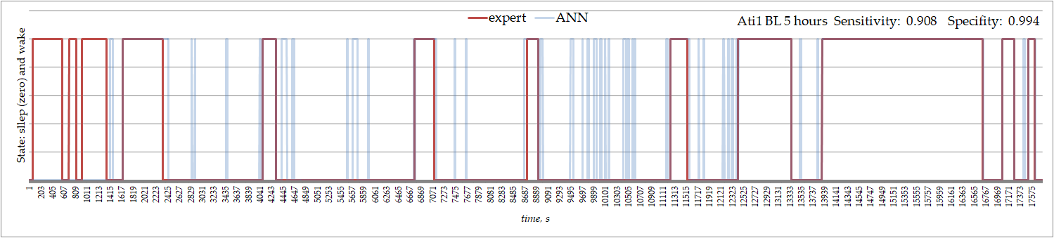 An important point to note is that sleep as defined by ANN was interrupted by short periods of wakefulness, which were missed by an expert. These short waking episodes during sleep might be interpreted as the sign of sleep fragmentation.
