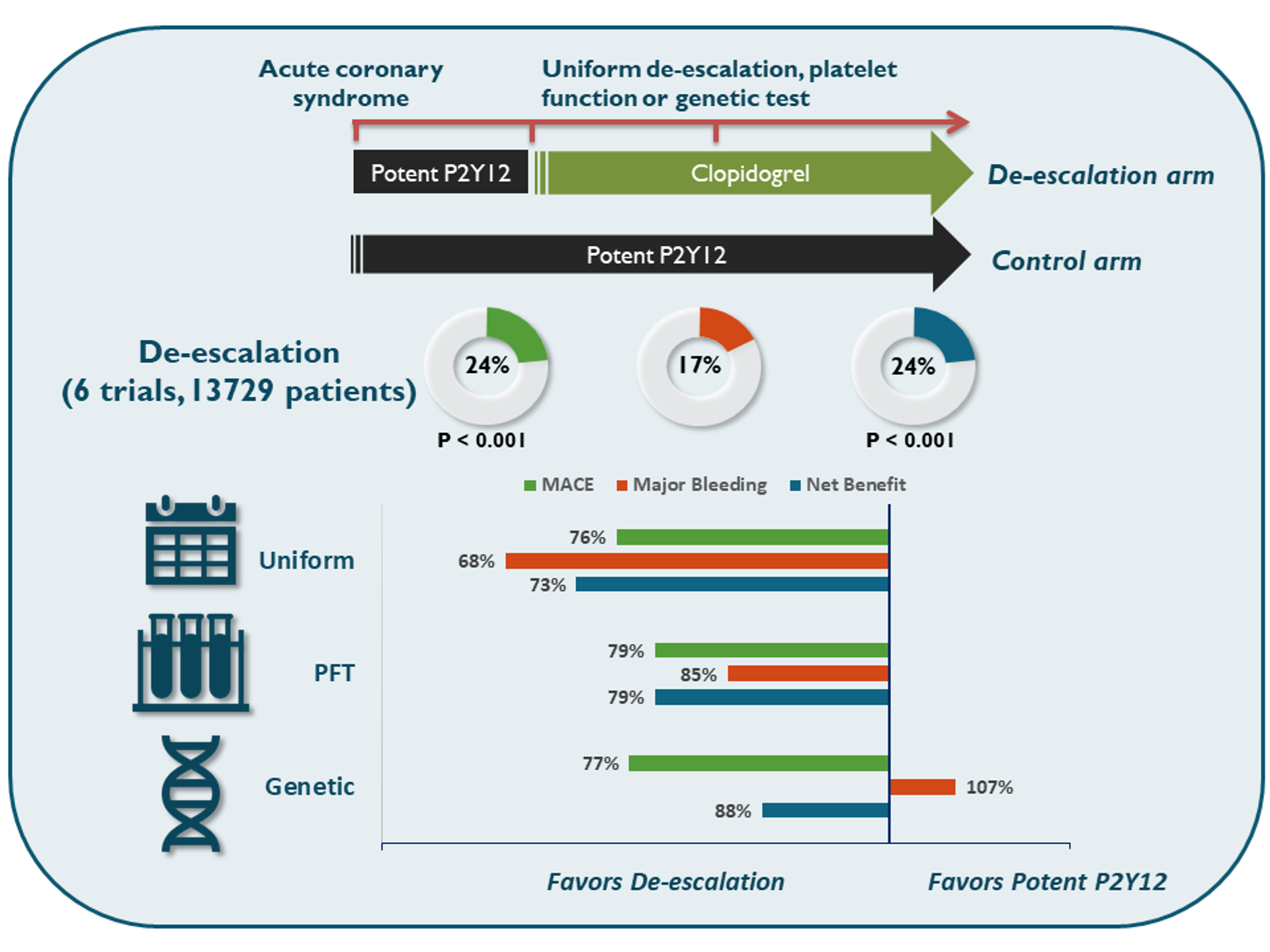 | De-escalation strategy | Uniform unguided de-escalation | Uniform unguided de-escalation | Genotype-guided therapy | Uniform unguided de-escalation | Guided by platelet function testing | Uniform unguided de-escalation |