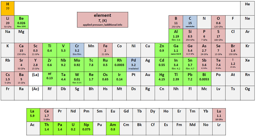 Figure 1. Superconducting elements in the periodic table (light green = superconductor in ambient conditions, light brown = superconductor under applied pressure, and light blue = superconductor with special conditions). Given are the abbreviations of the names, the transition temperatures, Tc, and the applied pressure or some extra info for each element. Hydrogen H is marked in orange concerning the prediction to be a room-temperature superconductor under high pressure. All data given are taken from [1—9]