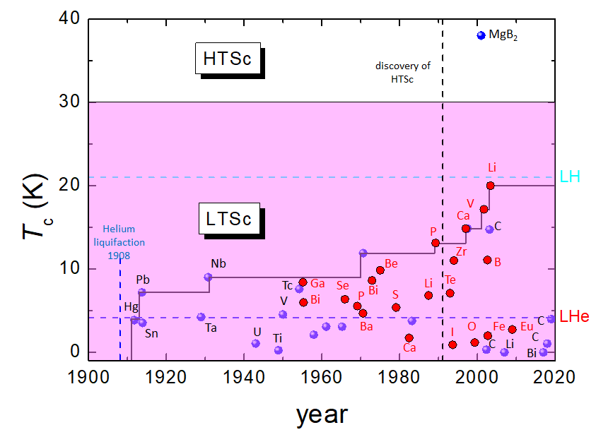 Figure 2. (a) Tc as a function of the year of discovery of the superconducting elements (● – ambient conditions, ● – under pressure). Note the highest Tc of all elements at 20 K for Li under pressure. The borderlines for liquid He (LHe) and liquid H (LH) are also presented. The 30 K-line marks the border between LTSc and HTSc materials, crossed by the alloy superconductor MgB2, which is given for comparison. (b) Logarithmic plot of Tc of various elements in ambient conditions with respect to their crystal structure (body-centered cubic (bcc), face-centered cubic (fcc), hexagonally close-packed (hcp), tetragonal (tetra), monoclinic (mono), orthorhombic (ortho), fcc* and double hexagonally close-packed (dhcp)). The highest Tc in ambient conditions is obtained for Nb with bcc structure, the lowest Tc to date has Bi with a monoclinic structure.