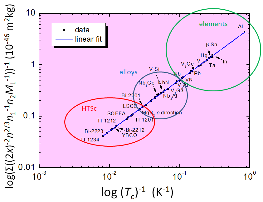 A very important point is here that all the data of Tc obtained fall on a common, straight line (blue), which follows the equation for a particle in a box [23] with the slope h2/(2π kB) = 5.061 × 10-45 m2 kg K. This result enables the RH formalism to act as a test for given predictions of Tc, e.g., for the case of metallic hydrogen as was done recently in Ref. [30].