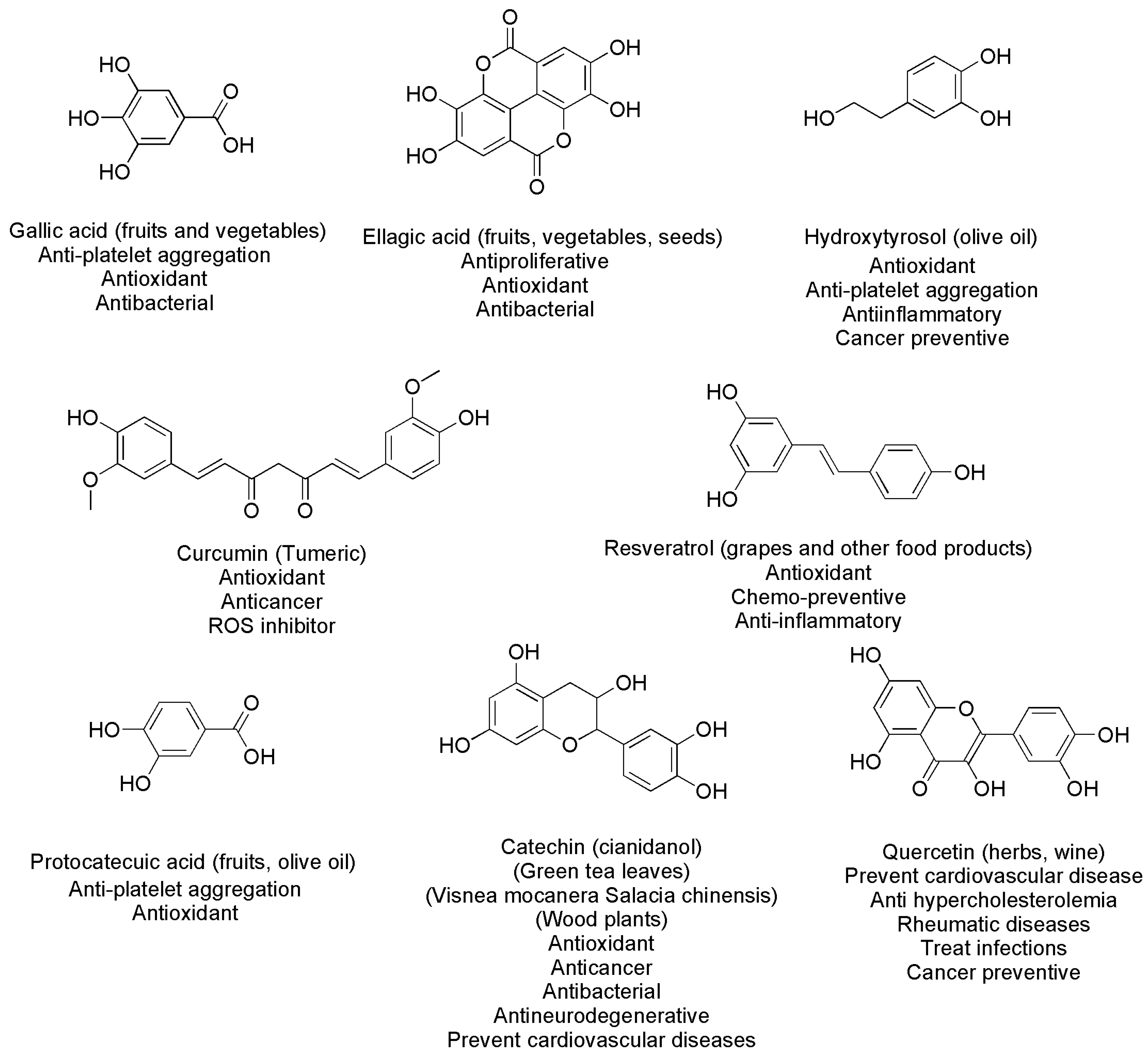 Action against free radicals, anti-inflammatory, anti-allergenic Inhibition of platelet aggregation, protective against hepatotoxins |