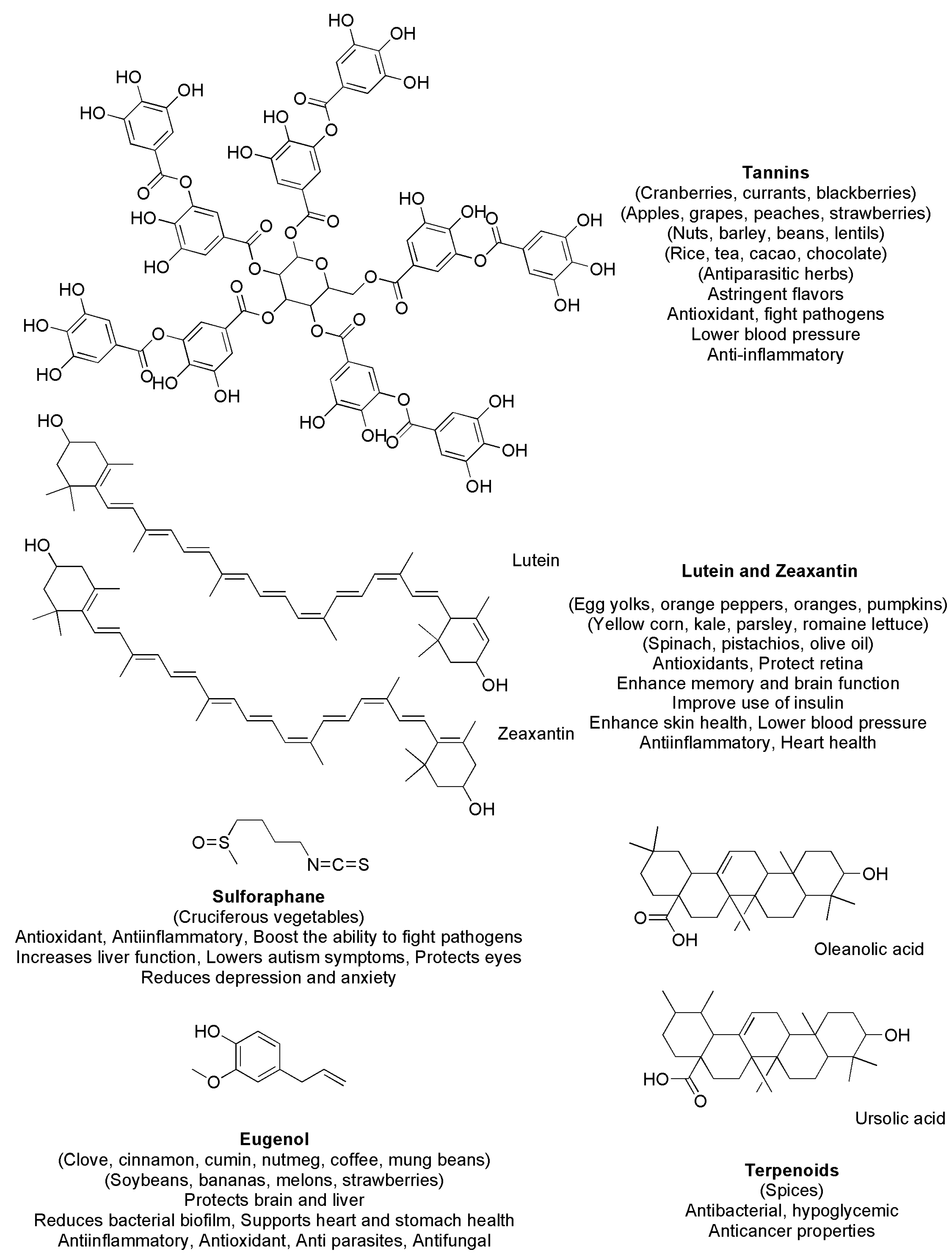 Anthocyanins, ellagic acid, eugenol Hesperidin Lycopene, tannins, quercetin |