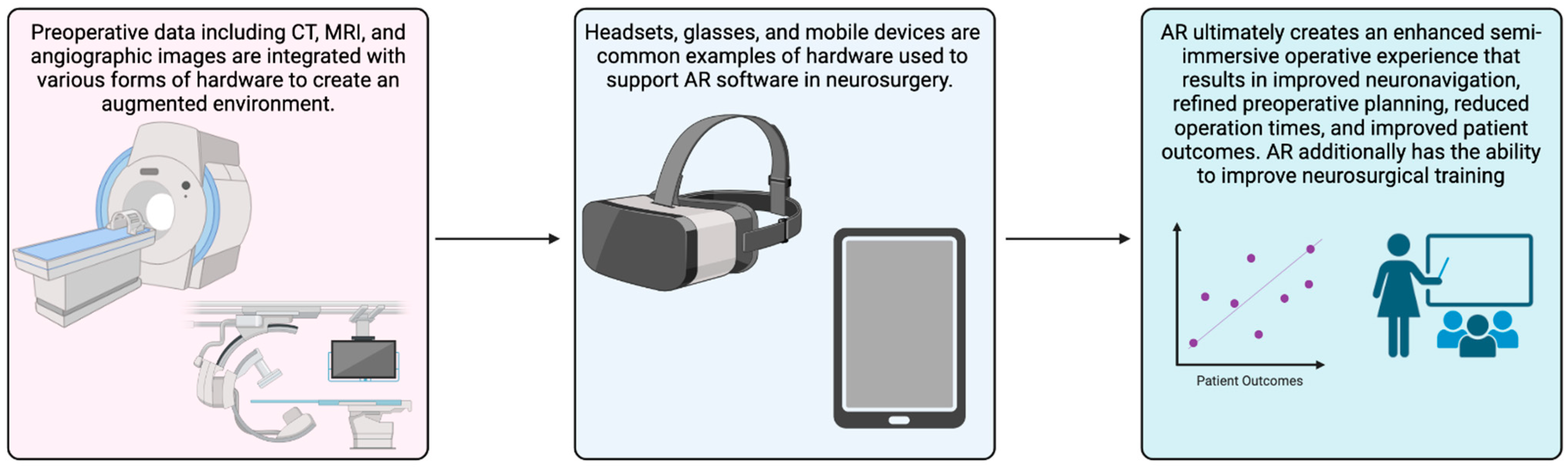 Augmented reality (AR) involves the overlay of computer-generated images onto the user’s real-world visual field to modify or enhance the user’s visual experience. With respect to neurosurgery, AR integrates preoperative and intraoperative imaging data to create an enriched surgical experience that has been shown to improve surgical planning, refine neuronavigation, and reduce operation time. In addition, AR has the potential to serve as a valuable training tool for neurosurgeons in a way that minimizes patient risk while facilitating comprehensive training opportunities.