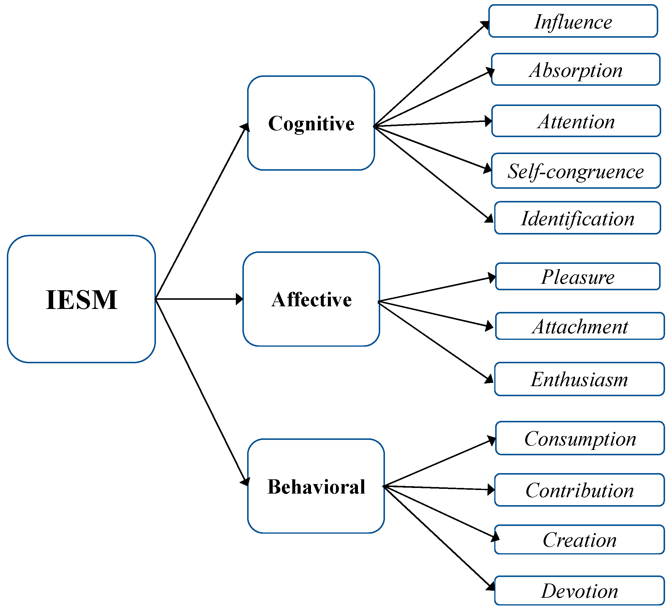 | Mirbagheri and Najmi (2019) [23] | Consumers’ engagement with SM activation campaigns | Attention, interest and enjoyment, participation | 12 |