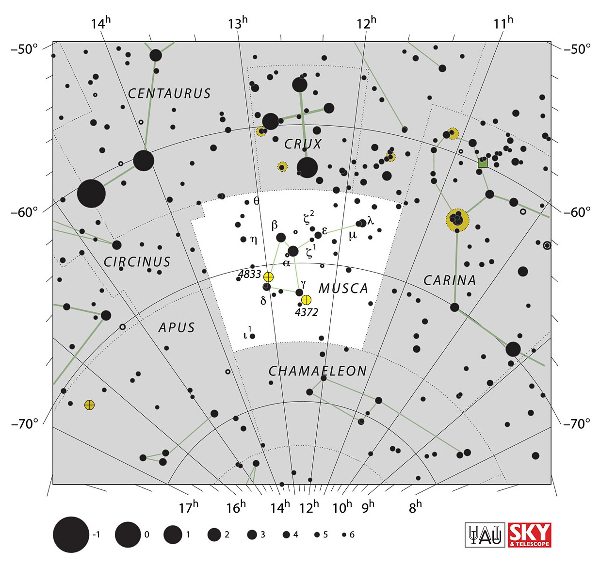 Figure 1. IAU chart of Musca. Source: https://www.iau.org/static/archives/images/screen/mus.jpg. Credit: IAU and Sky & Telescope. Reproduced under CC BY 4.0 license.