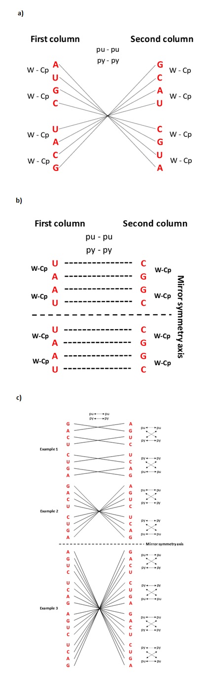 Figure 1. Specific symmetries of each base from codons of the genetic code. (a) The centre point of mirror symmetry for the first base of codons in the SSyGC table. Equal first bases in the opposite pair of boxes on each symmetry line passing through the centre point. The first bases pointed the composing principle of codon boxes in the whole SSyGC table (in each box all four codons have identical first and second bases): first bases from a pair of boxes in a vertical direction have Watson-Crick pairing (W-Cp); the pair of boxes in a horizontal direction have purine-purine (pu-pu), pyrimidine-pyrimidine (py-py) pairing. (b) The second base of codons in the SSyGC table. Each pair of bases in the vertical direction are in the form of Watson-Crick base pairing (A↔U, C↔G), and in the horizontal direction are in purine—purine (G↔A) and pyrimidine—pyrimidine (C↔U) pairing. Both halves of code are identical according to the horizontal symmetry axis. It is very important to observe that the second bases in the whole left column are weak A and U, and in the right column are strong C and G. Due to this separation, the important rule of codon second base in differentiation of the amino acids with two or four codons in the flow from mRNA to tRNA is emphasised, which is important for the translation process especially wobbling pairing in proteinogenesis [1]. (c) The centre points of cascade mirror symmetry for the third base of codons in the SSyGC table. All connecting lines between the same bases in the left and right columns passing through the centre point of the 1st, 2nd and 3rd example of mirror symmetry. Each cascade mirror symmetry comprises all third bases of the whole genetic code. Also, each pair of bases in the vertical and horizontal directions are in the form of purine—purine (G↔A) and pyrimidine—pyrimidine (C↔U) pairing. The third bases of the vertical pair of boxes have Watson-Crick pairing (G-A-C-U → C-U-G-A and A-G-U-C → U-C-A-G) and the newly discovered purine-pyrimidine symmetries of the SSyGC table. The Standard Genetic Code table ignored the third base of codons because all 16 boxes have an identical U-C-A-G alignment of the third base and cannot show Watson-Crick (codon—anticodon) symmetries between bases and codons [1][2].