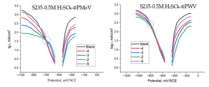 In both Figures 2 and 3, the appearance of an isopotential point can be noted on the cathodic branch, more pronounced in the case of @PMoV. The equipotential points, where several curves meet, indicate a phenomenon related to the degree of coverage of the electrode with respect to correlated to the irreversible blocking of the electrode surface, independent of the potential, which would be explained by the stronger adsorption of the oxidant anion of @PMoV, compared to that of @PWV. This behavior leads to the reduction in the cathodic current density and, implicitly, of the corrosion current density. Similar results have been obtained for other related polyoxometalates [29].