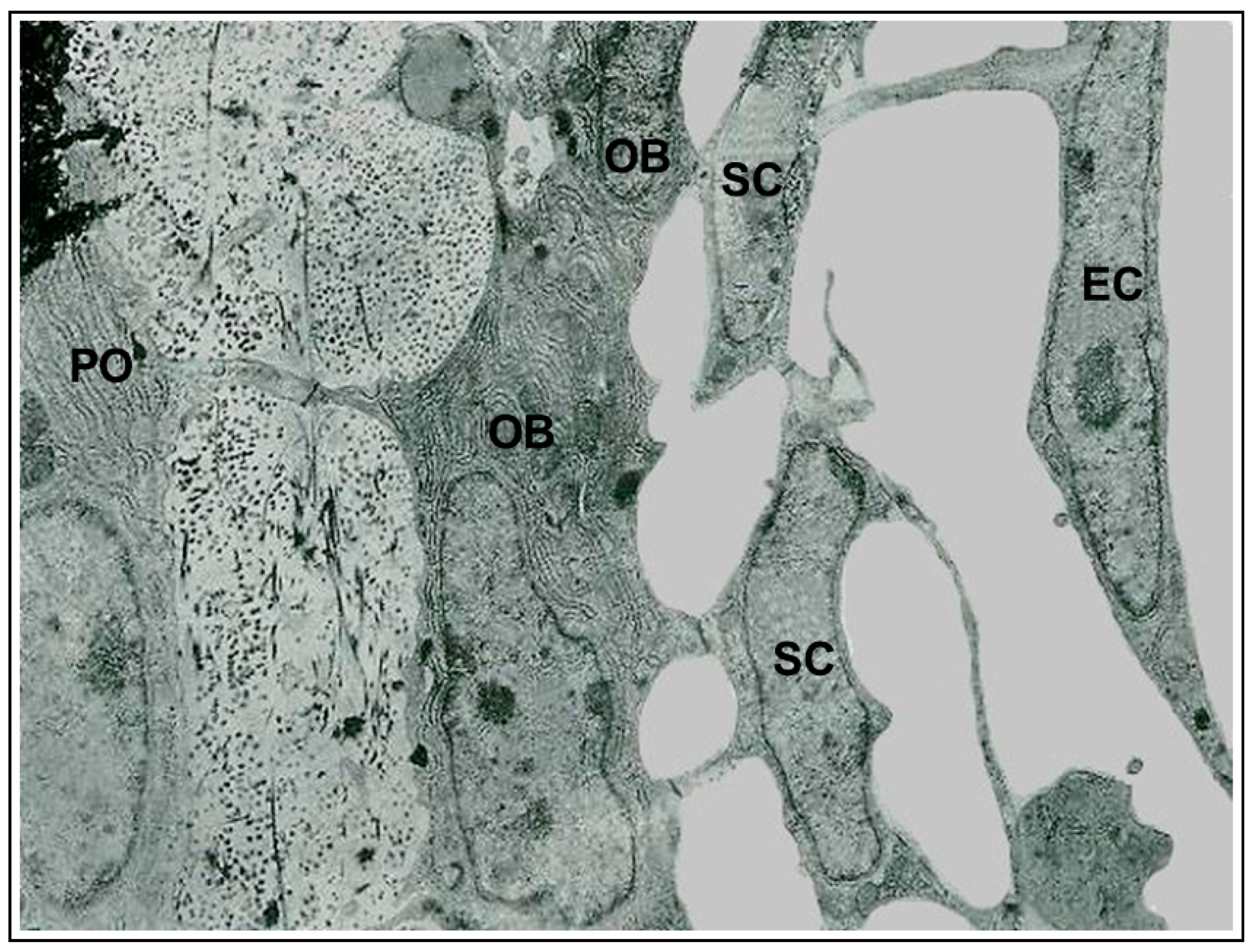 At the end of the process, the osteocytes are confined to lacuno-canalicular cavities, “prisoners” inside the mineralized matrix. Despite this fact, they are connected, thanks to the dendrogenesis process, to each other and with the bone cells on the vascular surfaces through a network of dendrities, running within the canalicular network; this condition allows osteocytes to act as “orchestrators” of bone processes [12][13]. Prerequisite for that is the existence of junctional complexes occurring among osteocyte cytoplasmic processes [7][14][15], suggesting that the bone cells of the osteogenic lineage, arranged in network (Figure 2), might act as a functional syncytium, that includes also the cells covering the vascular bone surfaces, bone lining cells [15] or osteoblasts [16].