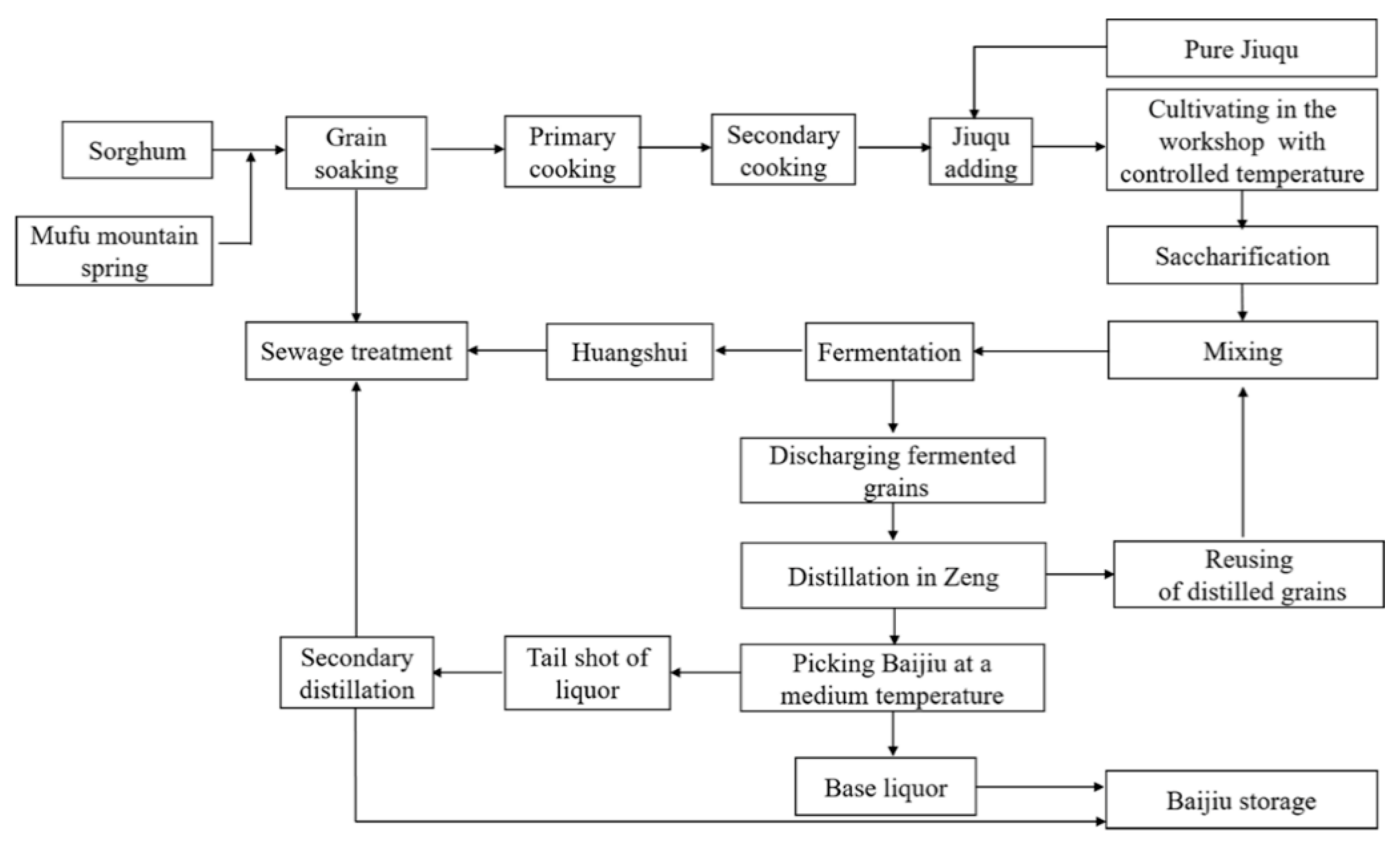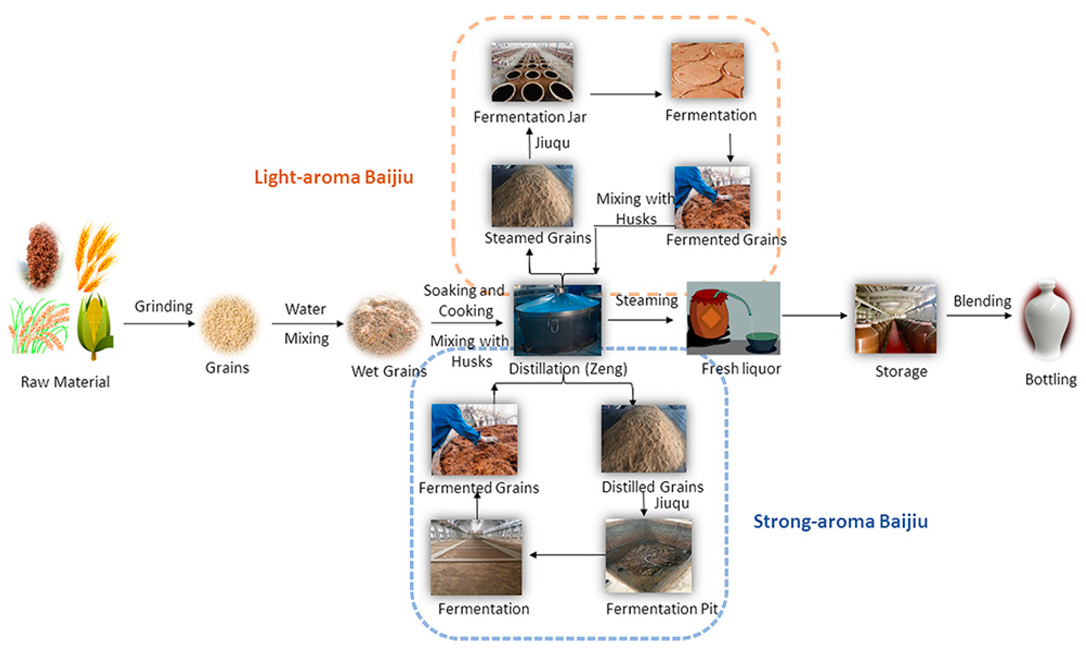 Baijiu is a type of distilled liquors and is made from grain fermentation induced by Daqu, Xiaoqu and Fuqu as possible sacchariferous agents through solid saccharification, fermentation, distillation in barrels (named Zengtong), long-time storage in porcelain jars and blending processes.