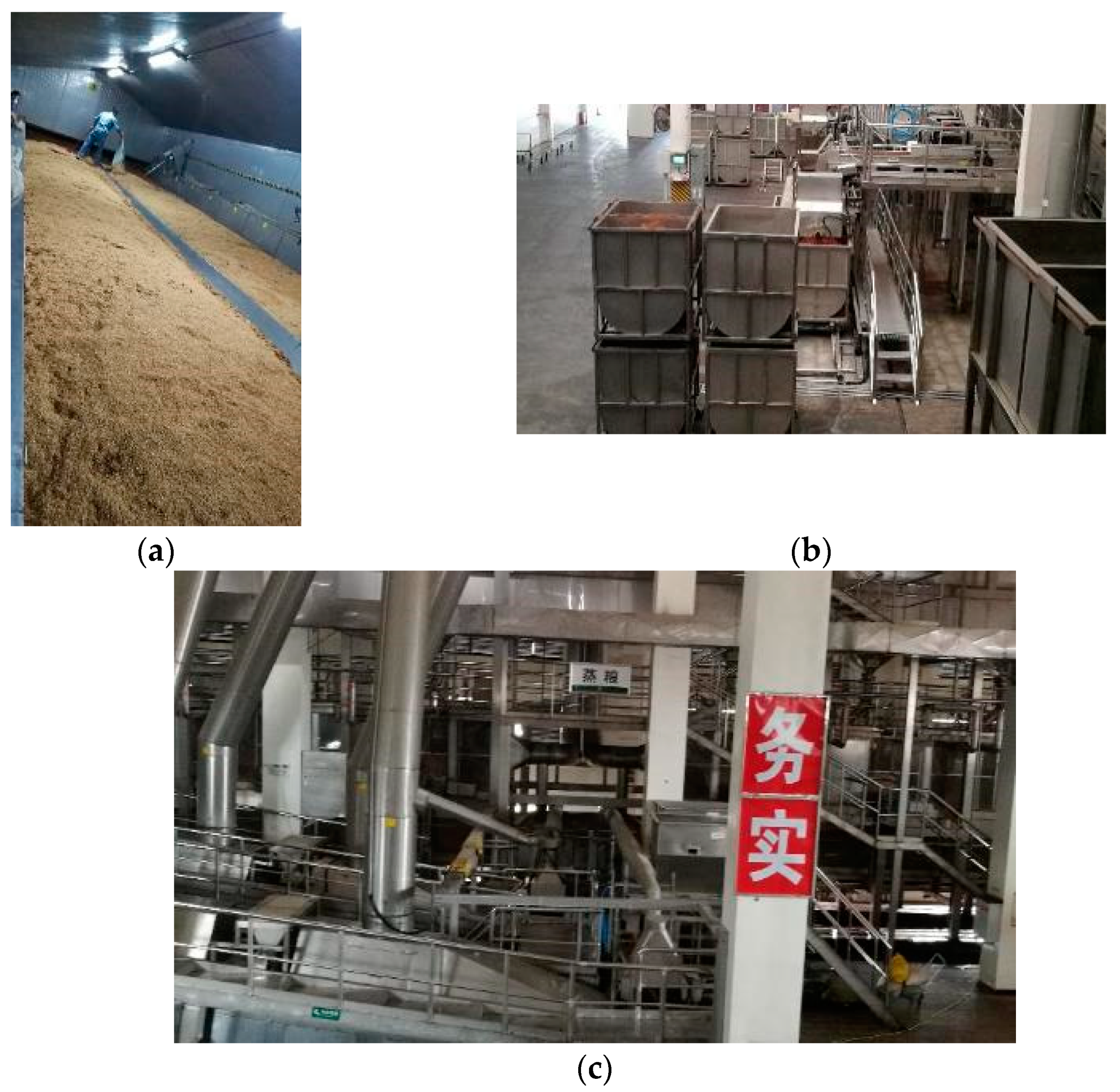 Relatively speaking, the degree of automation and intelligence for the Xiaoqu MFB produced by SSF is higher because of the use of the SSFT. For example, in 2010, Fenglin distillery of Jingpai Co., Ltd. (Huangshi, China) used an SSFT as the fermentation container for the brewing of Xiaoqu MFB for the first time [7]. Then, a complete automatic production line including grain steaming, cooling, Jiuqu addition, saccharification, fermentation, and distillation was gradually established as the “digital intelligent brewing demonstration workshop of Chinese Baijiu”. The production process is shown in Figure 9, and it is described as follows [8]. First, the raw grains were soaked in a stainless-steel tank for 20–24 h; then, they were transported by self-weight to a rotary grain steaming pot for high-pressure cooking. After cooking, the steamed grains were cooled down, and the Jiuqu was automatically added and mixed with the steamed grains. Then, the mixture was transported by a chain plate conveyor belt at a slow speed to saccharification workshops equipped with temperature-controlling equipment as shown in Figure 10a. After saccharification for 24 h, screw conveyors were used to evenly mix the saccharified and distilled grains, and movable fermentation tanks were used as the fermentation containers, as shown in Figure 10b. The fermentation tanks were placed in a fermentation chamber with a temperature control system for 15–18 days. After fermentation, the tanks with the fermented grains were placed on turnover machines by the forklift trucks, so as to discharge the grains to be transported to the distillation part by conveyor belts. The steamer-filling was conducted by intelligent robots, and automatic liquor picking was realized based on an online monitoring of the alcohol content. The obtained base liquor was weighed on site and was transported to the storage tanks directly through a pipeline. The distilled grains were discharged into another container through an openable bottom of the steamer. During the entire production process, only one or two workers were required to inspect the production line in the workshop as shown in Figure 10c; another few workers monitored the production parameters in the control center. The number of workers in the brewing workshop was reduced by 80% after the above production line was used, whereas the production efficiency was greatly improved.