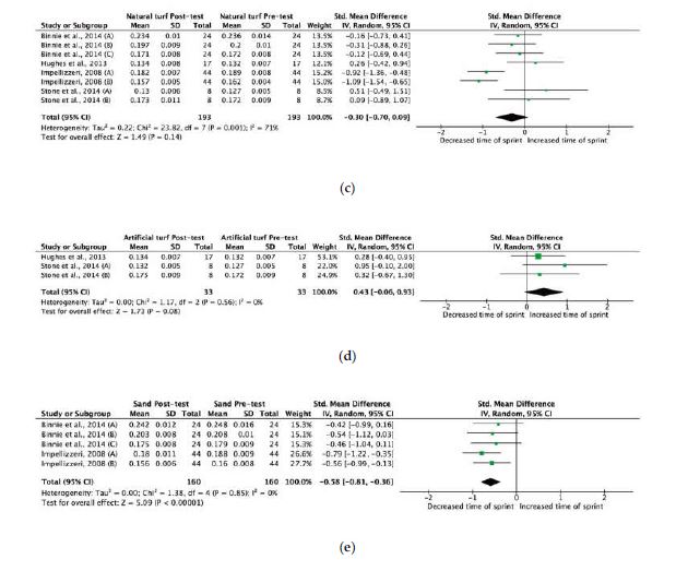 Figure 4. Standardized mean difference (SMD) between sprint time in: a) natural vs. artificial turf; b) natural turf vs. sand; c) natural turf pre- and post- sprint time assessment with different training methods; d) artificial turf pre- and post- sprint time assessment with different training methods; e) sand turf pre- and post- sprint time assessment with different training methods. Square represent the SMD for each trial. Diamonds represent the pooled SMD across trials.