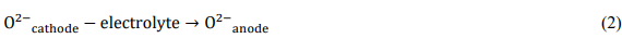 Oxygen anions formed at the cathode migrate through the ionically conductive, solid oxide electrolyte membrane to the anode side as shown by equation (2)
