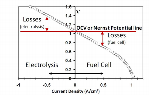 Since a real fuel cell has resistance losses, varying the voltage will cause the V-i curve to deviate from the Nernst Potential. For positive currents, the cell is said to be in "fuel cell mode" and the cell potential is below the Nernst Potential. The spontaneous anode oxidation reaction is then used to drive electrons in the external circuit, to cause oxygen dissociation at the cathode, and to transport oxygen anions to the anode for further fuel oxidation. At negative currents, the cell operation is in "electrolysis mode". In this mode, the excess countervoltage (above OCV) is used to dissociate the oxidized fuel, for example H2O, forming the fuel (H2), while the oxygen anions are then transported through the electrolyte to produce oxygen gas at the electrode exposed to air. The slope of the V-i curve gives the overall cell resistance at each point,