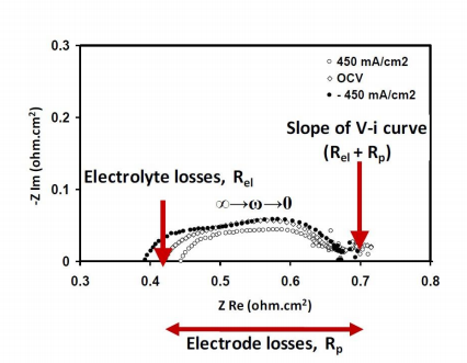 Rtotal consists of the losses from the electrolyte and each of the electrodes. The electrolyte loss is simply the resistance associated with the transfer of O2- ions through the electrolyte and depends on the thickness and conductivity of the electrolyte material used. The electrode losses are the kinetic losses associated with the ease of the reactions occurring at the cathode and the anode. However, it is not possible to separate Rtotal into each of its constituent losses only by using V-i curves. Impedance spectroscopy is a technique used for this purpose, as described in the next sub-section.