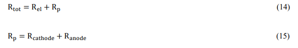 Rel is related to the conductivity and the thickness of the electrolyte used, while Rp is the sum of the non-ohmic resistances due to the cathode and anode reactions (equation 15).