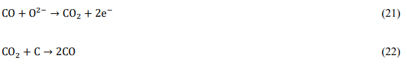 In these fuel cells being developed by Gur et al [31], oxygen anions from the electrolyte react with CO in the porous anode to form CO2 and release electrons (equation 21). A fraction of the CO2 is then recycled and passed through a bed of carbon particles to form CO by the reverse Boudouard reaction (equation 22). The CO produced from the Boudouard gasifier is then cycled to the anode for oxidation.