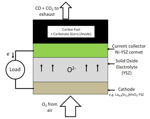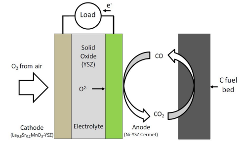 In the case of direct-carbon SOFCS, the overall anode reaction is that of the carbon being oxidized by oxygen anions from the solid oxide electrolyte (equation 18). However, direct contact between the solid fuel and the solid electrolyte is inefficient.
