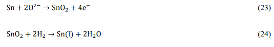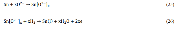 The operation of this system was suggested to rely on the diffusivity of the dissolved oxygen from the electrolyte in the molten tin (equation 25) and the diffusivity of the gaseous fuel into the molten tin for the fuel oxidation to occur (equation 26)[18][39].