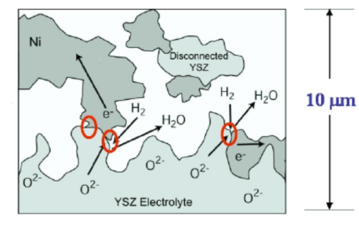 It is important to note that reactions at fuel cell electrodes can only occur at interfaces or lines of contact where the reactant, electronic conductor and ionically conductive phase all meet. These interfaces are known as three phase boundaries (TPB)[16]. To this end, typical gas-fuelled SOFC electrodes are usually porous composites of the electrolyte material with an active and electronically conductive phase, such as a metal or a conductive mixed-metal oxide. For the cathode reaction to occur, oxygen from air needs to be present at the line of contact between the suspended electronically conductive