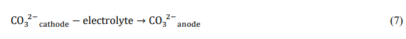 Carbonate anions formed at the cathode migrate through the ionically conductive, molten electrolyte-containing ceramic matrix to the anode side as shown by equation (7)