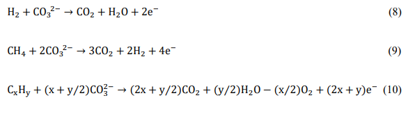 Carbonate anions react with fuel (e.g. H2, CH4, CxHy etc) fed to the conductive anode and release electrons into the external circuit as shown by equations (8), (9) and (10). CO2 from the reaction products is then recycled back to the cathode.