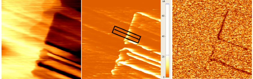 Figure 1. Topology (left), conductivity (middle), and piezoelectricity (right) of twin structures in WO3 at room temperature. The structure is tetragonal P-421m and piezoelectric [12]. Twin walls appear as borders between twin domains on the right, and as bright conducting regions in the middle panel. The piezoelectricity is short-circuited in the highly conducting domain walls, which now appear dark in the PFM image on the right (horizontal length of the image 1.5 µm, after [13]).