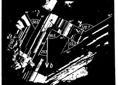 The orientation of ferroelastic twins is determined by the Sapriel conditions that twin walls are strain free [30]. Only two possible types of walls between twins are symmetry allowed. They are either completely fixed by the crystallography of the low symmetry phase or they are not. Fixed walls are called w-walls and flexible walls are called w’-walls. W-walls are related to mirror planes that are lost during the phase transition, while w’-walls contain equivalent diads inside the walls. The mineral palmierite is a typical example. Figure 2 shows the twin structure of a palmierite sample with composition Pb3(AsO4)2, which underwent a phase transition R-3m to C2/m. During the transition, the sample developed twins with w and w’ twin walls. The image shown in Figure 2 was taken along the pseudo-triad, which explains the almost threefold symmetry of the twin walls. The exact angles between the twin walls follow directly from the Sapriel condition and they deviate from the multiples of 90° and 30°. In 2020, Yokota et al. [31] found that all of the twin walls in palmierite are piezoelectric, while the twin domains are not. The structural symmetry inside the twin walls, namely m and 2, was confirmed.