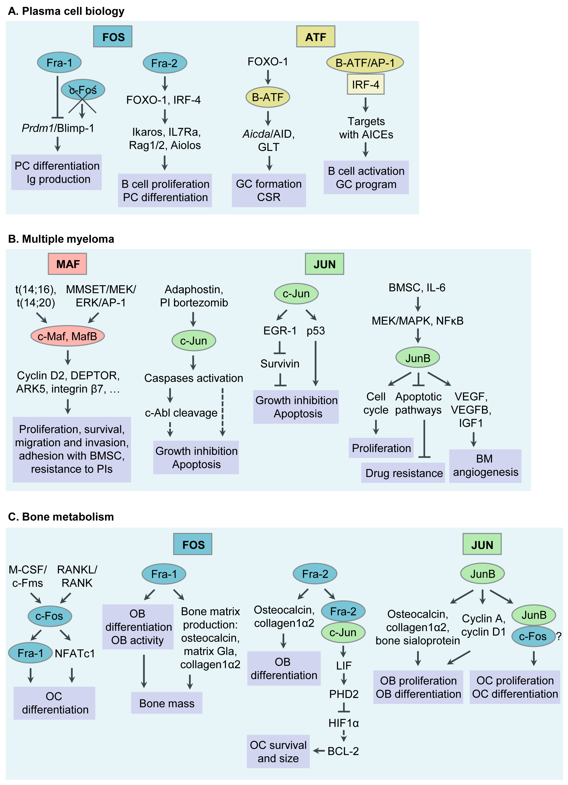 Figure 1. Functions of Activator Protein-1 (AP-1)/JUN, FOS, ATF and MAF transcription factor (TF) subfamily members in plasma cell (PC) biology, multiple myeloma (MM) pathophysiology, bone metabolism and MM associated bone disease. (A) Functions of AP-1 TFs in PC biology. (B) Functions of AP-1 TFs in MM pathogenesis. (C) Functions of AP-1 TFs in bone metabolism and MM associated bone disease. Ig, immunoglobulin; GC, germinal center; CSR, class switch recombination; AID, activation- induced cytidine deaminase; GLT, germline transcript; AICEs, AP-1-IRF composite elements; BM, bone marrow; BMSC, bone marrow stromal cell; PI, proteasome inhibitor; OC, osteoclast; RANKL, receptor activator of NFκB ligand; M-CSF, macrophage colony stimulating factor; NFAT, nuclear factor of activated T cells; LIF, leukaemia inhibitory factor; OB, osteoblast.