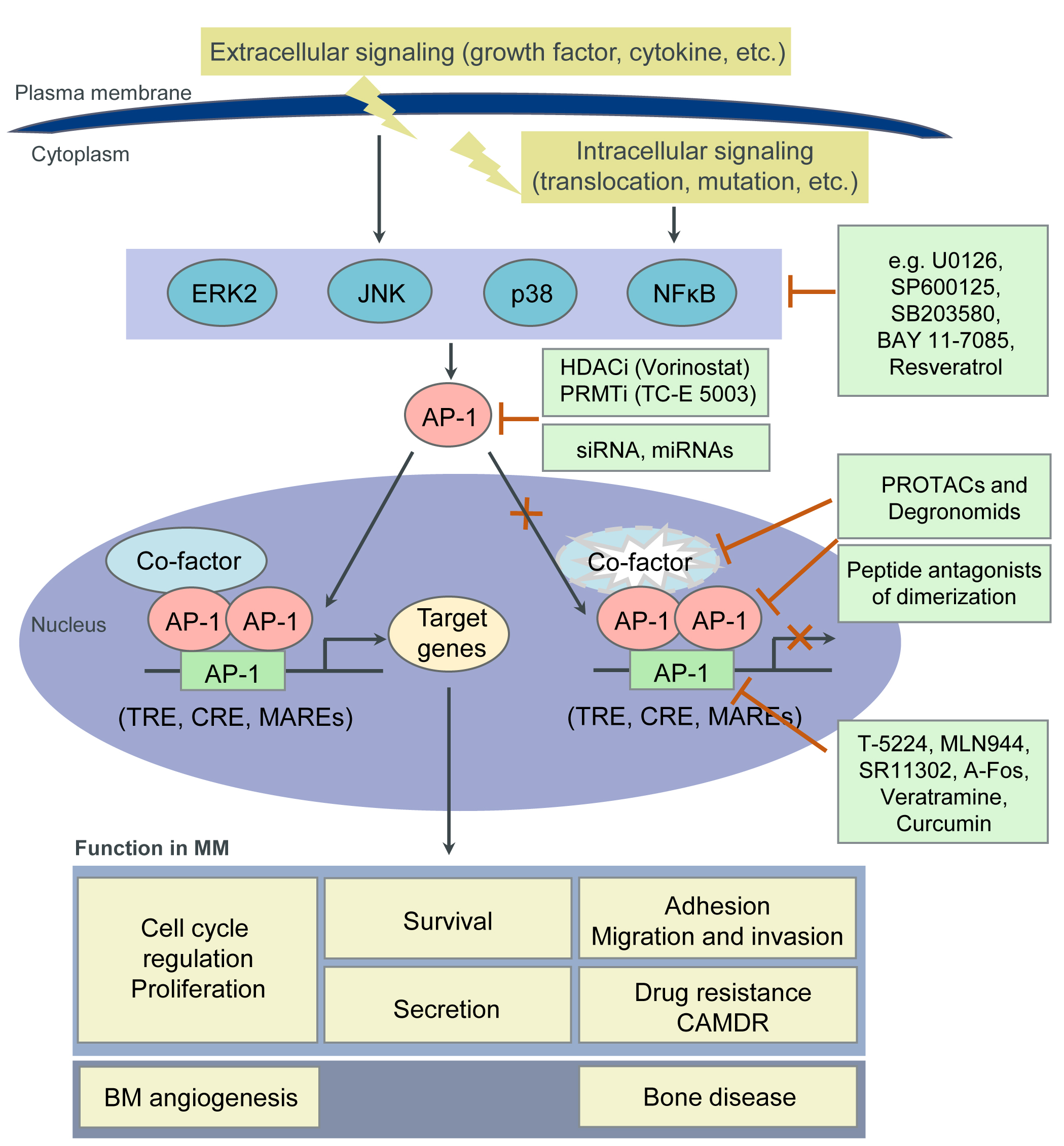 Accumulating evidence demonstrates a crucial role of deregulated AP-1 TFs in tumorigenesis in general, and MM in particular. AP-1 TFs therefore represent appealing therapeutic targets. However, TFs have been considered “undruggable” until recently due to their structural disorder (three-dimensional (3D) structure and architecture are very labile and dependent on TF interaction with functional proteins), their lack of tractable active sites (large protein-protein interfaces, lack of deep protein pockets) and their intracellular (often nuclear) localization. Nevertheless, with the progress of our understanding of the biochemical and biological properties of TFs, this paradigm does not hold true any longer. Indeed, members of the AP-1 family have emerged as worldwide actively pursued therapeutic targets, with a potentially high therapeutic index