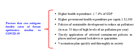 Studies have found that sustainable environment plays a vital role to reduce risk factors of epidemics and prevent pandemics similar to COVID-19 [1,51]. Scholars maintain that a low rate of fatality is associated with a low level of air pollution [1,51–54]. Studies have also shown that countries with 72% of the population exposed to levels exceeding the WHO guideline value of air pollution have lower fatality rates of COVID-19 than countries with 98% population exposed to similar levels of air pollution [55]. Coccia [1] demonstrates that polluted cities should not exceed 48 days per year of high levels of air pollution, in the presence of climate conditions having little wind, because when the annual period of air pollution is higher than 100 days, the reduction of air quality and other factors can damage the health of the population and support the transmission dynamics of infectious diseases in society with consequential socioeconomic problems [53,56].