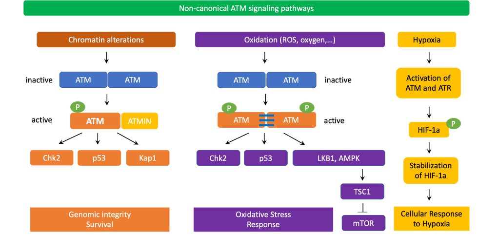 ATM signaling pathways could be classified into the canonical pathway and a diverse array of non-canonical pathways. In the canonical pathway, ATM collaborates with the MRN complex (Mre11/Rad50/NBS1) to activate the cellular DNA-damage response. ATM also uses a number of other non-canonical pathways to respond to other types of cellular stresses [34].