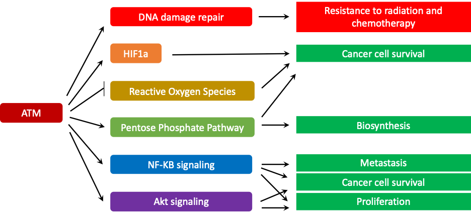 Figure 4. The diverse roles of ATM in cancer cells. In some cancer cells that have developed mechanisms to evade apoptosis and cell cycle arrest, increase in ATM signaling may confers significant advantages for cancer cell survival, biosynthesis, proliferation, metastasis, as well as resistance to radiation and chemotherapy.