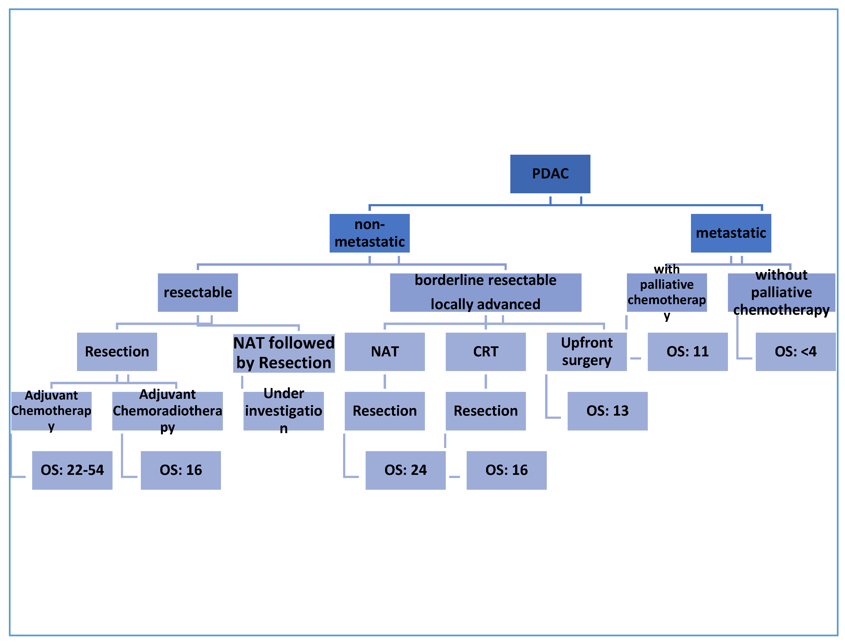 The only curative therapy for PDAC is surgical excision [9]; however, only 10–20% of patients are found to be eligible for resection at the time of diagnosis. More than 50% of patients are found to have metastatic disease at the first presentation [10]. To date, treatment approaches for patients with PDAC depend on the clinical and anatomical stage of the disease [11]. Notably, a great deal of ongoing studies are relying on the molecular pathology of PDAC to identify individualized, tailored plans for PDAC patients [12][13][14]. The initial workup process of PDAC aims to confirm the diagnosis and to look for evidence of distant metastasis [15][16]. Using imaging modalities, non-metastatic PDAC can be classified into resectable, borderline resectable, and locally advanced PDAC based on the involvement of the surrounding arterial (superior mesenteric artery, common hepatic artery, and celiac axis) and venous (superior mesenteric vein or portal vein) structures, and other nearby organs and lymph nodes [17][18]. According to the National Comprehensive Cancer Network (NCCN) guidelines published in 2017, certain criteria should be applied to obtain eligibility for surgical resection; the main goal is to involve as many patients as possible under the umbrella of surgical treatment [19]. The treatment outcome and the median overall survival depends in the first place on the stage of the PDAC, as mentioned in Figure 1.