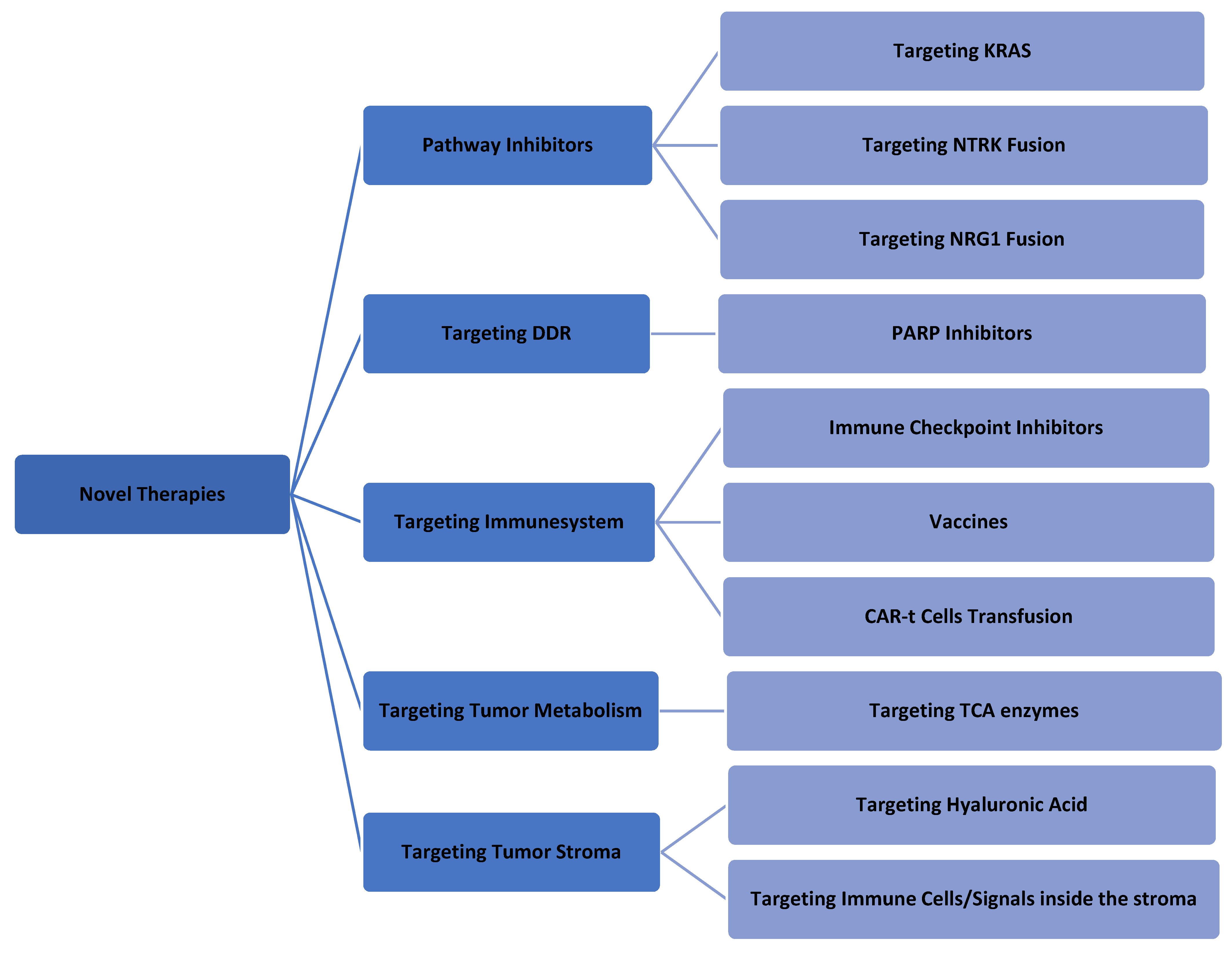 A better understanding of the molecular pathology of PDAC could allow researchers to investigate more new modalities for PDAC treatment [20][21][22]. Most of these strategies are still under investigation, and some of them have been aborted because of negative results. As a general rule, the combination of these new modalities (one targeted molecule agent and one cytotoxic agent) leads to better outcomes [23]. Figure 2 summarizes the currently available novel therapies for PDAC.