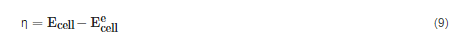 Apart from the theoretical energy consumption during electrolysis, several additional electrical barriers need to be overcome for the electrolysis process to occur. All these barriers contribute to the required cell voltage of the electrolysis () and constitute the overpotential, which is defined as the difference between the theoretical cell potential (i.e., the equilibrium cell potential,