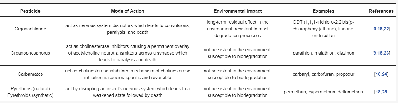 18]. They can also be classified into four main groups according to the chemical nature of their active ingredients as follows: organochlorines, organophosphorus, carbamates, and pyrethrins and pyrethroids [
