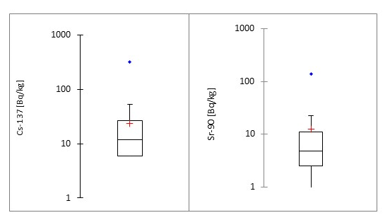 Fig 1 Box plot-distributions of the activities in the collected moss samples (in Bq/kg dw).