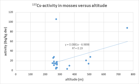 Fig 3 Slight Correlation between 137Cs-activity in moss and the altitude of the find spots.