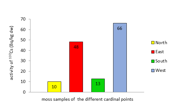 Mosses grown on a tombstone at a graveyard in Basel West showed the highest activities of fallout nuclides. The graveyard is situated at the border to France, bordering on open, not built-up fields to the west. This is also the main wind direction in Basel. Mosses (orthotrichum anomalum) on a tombstone showed different activities of fallout nuclides: On the west side of the tombstone, activity was highest: (137Cs: 206±11 Bq/kg dw). Whereas, activity was remarkably lower at the foot of the tombstone in East direction (137Cs: 49±4 Bq/kg dw).