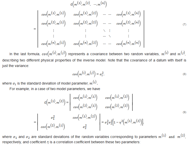 For example, in the case of two model parameters (e.g., density and magnetic susceptibility), the Gramian is computed as follows: