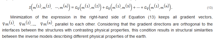 One of the most widely used approaches to imposing the structural constraints on the results of the joint inversion is based on the method of cross gradients [13][14][15][16][17]. The basic idea behind this method is that the gradients of the model parameters should be parallel in order to enforce the geometrical similarities between the interfaces of the models. Within the framework of the cross-gradient method, this requirement can be achieved by minimizing the norm square of the cross product of the gradients of these functions: