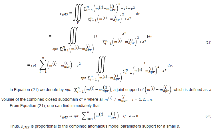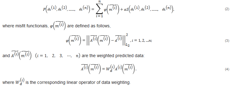 The structural similarities between various petrophysical models of the subsurface can be enforced by using the joint total variation or focusing stabilizers [21][22]. For the solution of a nonlinear inverse problem shown in Equation (1), following [21][22], we introduce the following parametric functional with focusing stabilizers,